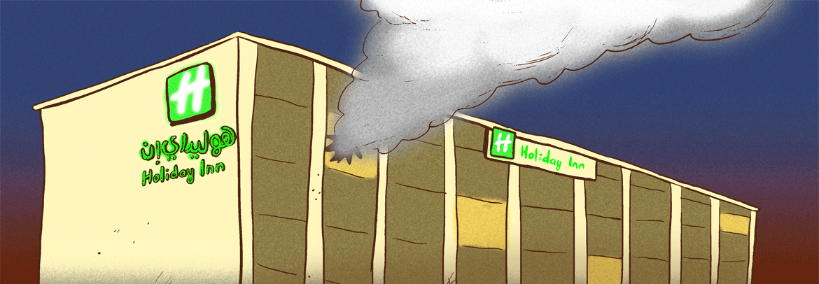 I went to this same Holiday Inn later on, and I’m sorry to say that they’ve fixed all the bullet holes. It’s as boring as any other Holiday Inn—you can see it for yourself, right past the fake waterfall pouring out of the fake boulder, kittycorner to the HyperPanda supermarket. Got that green logo and everything. You’d think they’d make some commercial hay from their illustrious background, like “NOW, 20% more bulletproof!” or “Now YOU can rent the suite where a Saudi prince crapped his robe in terror!” but nope, no plaques, no bulletholes, just a pool with one of those disgusting nargilah gazebos.