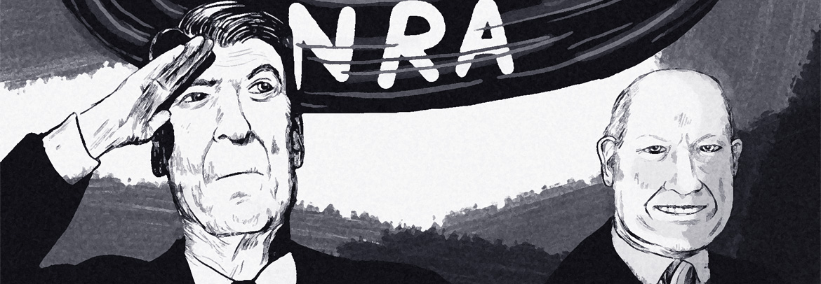 What the establishment didn’t get about Harlon’s new souped-up NRA gun-cult until too late — in fact what most still don’t get — is that the more batshit disconnected from demonstrable reality your message is, the more fanatical and organized-for-war your organization will be. If you can get people to make that leap of faith —well, then you’ve got real power. Reagan understood that sort of power well: Pandering to the far-right John Birch Society cult won him California’s governor’s seat in 1966, and in 1980, he promised to implement Harlon Carter’s radical pro-gun agenda as soon as he took office. Unfortunately that pro-gun push got delayed by an assassination attempt on Reagan’s life, but nearly bleeding to death didn’t change Reagan’s mind (or what passed for Reagan’s mind).